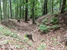 The Alte Burg on the peak of the Reuschberg is a sort of circular rampart, with remains of both earth and masonry walls, long thought to date to the La Tène period. However, excavations in 2005 indicate that it most likely is a 10th-century refuge castle, with some elements added later (11th or 12th century). Over the centuries, locals have used the fortification as a source of construction materials, reducing the remains to just foundations. The fortifications are roughly oval in form and encompass an area of roughly 1,300 square meters. A break in the wall likely once served as a gate. Research also revealed signs of internal buildings, including the foundation of a central tower.[3][4]:24
