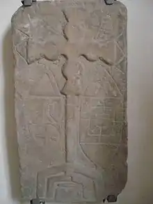 The church St. Katharina in Ernstkirchen was mentioned first in 1184. In the 14th century, the original Romanesque church was reconstructed with a Gothic vaulted ceiling and an octagonal tower. Over the centuries, the church was redesigned several times in different styles (Baroque, Gothic Revical), but in 1958/67 the church was mostly returned to its early Gothic state (although the tower roof retains its Baroque onion shape). During this renovation, an early medieval stone tablet of unknown date was discovered, which indicates a very early ecclesial presence at this location. About one meter in height, stylistically, it has been linked to the Hiberno-Scottish mission. The tablet shows a Crux gemmate surrounded by other symbols that are hard to identify, including possible moon and sun symbols and a type of "checkers board". It likely was removed from a visible position in the church around the year 1300 and buried beneath the altar.[5][3][4]:24–5