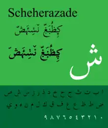 Scheherazade New, formerly Scheherazade, is a traditional Naskh styled font for Arabic script created by SIL, freely available under the Open Font License. It supports a wide range of Arabic-based writing system encoded in Unicode. The font offers two family members: regular and bold.[1]
