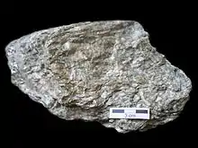 Schist (pronounced /ʃɪst/ SHIST) is a medium-grade metamorphic rock formed from mudstone or shale.[1] Schist has medium to large, flat, sheet-like grains in a preferred orientation (nearby grains are roughly parallel). It is defined by having more than 50% platy and elongated minerals (such as micas or talc),[2] often finely interleaved with quartz and feldspar.[3] These lamellar (flat, planar) minerals include micas, chlorite, talc, hornblende, graphite, and others. Quartz often occurs in drawn-out grains to such an extent that a particular form called quartz schist is produced. Schist is often garnetiferous. Schist forms at a higher temperature and has larger grains than phyllite.[4] Geological foliation (metamorphic arrangement in layers) with medium to large grained flakes in a preferred sheetlike orientation is called schistosity.[4]
