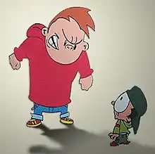 School bullying, like bullying outside the school context, refers to one or more perpetrators who have greater physical or social power than their victim and act aggressively toward their victim by verbal or physical means.[2][3] This behavior is not a one-off episode; it must be repetitive and habitual to be considered bullying.[2][3] Students who are gay, have parents of lower educational levels, are thought to be provocative, are perceived to be vulnerable, or are atypical or considered outsiders are at higher risk of being victimized by bullies.[4][5][6][7] Baron (1977) defined such "aggressive behaviour as behaviour that is directed towards the goal of harming or injuring another living being who is motivated to avoid such treatment".[8]