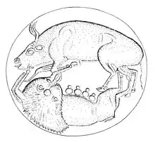 The matrices for pendent seals were sometimes accompanied by a smaller counter-seal, which would be used to impress a small emblem on the reverse of the impression. In some cases the seal and counter-seal would be kept by two different individuals, in order to provide an element of double-checking to the process of authentication. Sometimes, a large official seal, which might be in the custody of chancery officials, would need to be counter-sealed by the individual in whose name it had been applied (the monarch, or the mayor of a town): such a counter-seal might be carried on the person (perhaps secured by a chain or cord), or later, take the form of a signet-ring, and so would be necessarily smaller.[19] Other pendent seals were double-sided, with elaborate and equally-sized obverses and reverses. The impression would be formed by pressing a "sandwich" of matrices and wax firmly together by means of rollers or, later, a lever-press or a screw press.[20][21] Certain medieval seals were more complex still, involving two levels of impression on each side of the wax which would be used to create a scene of three-dimensional depth.[22][23]