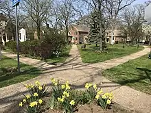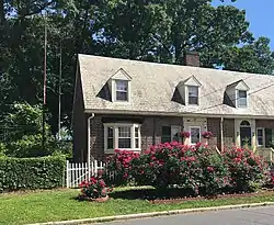 The homes and streets were laid out to preserve as many trees as possible. This accounts for the varying setbacks for homes from the street and some of the curves in the roads. For example, Forest Court was diverted to save a group of trees at the corner.[5] Every street was planted with a specific American tree: Forest Street and Forest Court : White oak (Quercus Alba); Burnham Street & Flanders Street : Basswood or American linden (Tilia Americana); Cole St : Sweetgum (Liquidambar Styraciflua); Sims Street: Sugar maple (Acer Saccharum); and Alsace Street: American Elm (Ulmus Americana). There were probably American ash trees (Fraxinus Americana) on Iranistan Avenue, but there's only one left. Many of the original trees have succumbed to emerald ash borer and Dutch elm disease or heavy traffic for the sugar maples. Salt in the ground after the hurricane floods in 2011 and 2012 took out most of the basswood and sweetgum trees.[29]