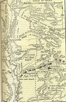Posts held by the Ottoman cavalry formed a defensive line extending across the valley from Umm esh Shert.[91] This defensive line formed a line of communications, linking the German and Ottoman forces in the Fourth Army west of the Jordan River with the VIII Corps defending Shunet Nimrin. These defensive posts were attacked by the 4th Light Horse Brigade mounted, and driven back towards Mafid Jozele 4.5 miles (7.2 km) north of Umm esh Shert.[51][91] While the 3rd and 4th Light Horse Brigades continued northwards the 1st Light Horse Regiment (1st Light Horse Brigade) was ordered to attack the German and Ottoman force on Red Hill about 6,000 yards (5,500 m) north-east of Umm esh Shert.[92]