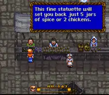 In the four worlds of Secret of Evermore, the in-game currency changes. The shopkeepers in Prehistoria exchange talons; in Antiqua, gemstones; in Gothica, gold coins; in Omnitopia, credits.[3] There are individuals in each region who offer to convert the player's money to the local currency. In either of the game's two marketplaces (in Antiqua and Gothica, respectively), the storekeepers offer to trade in goods instead of money. Certain goods, such as rice, spices, and tapestries, can be bought using the local currency, but others must be exchanged for other goods.[10] Most vendors only specialize in one type of good, and some rare items require an extensive amount of trading to obtain.[3][6]
