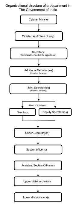 In the structure of the Indian government,[13][14][15] a secretary is the administrative head of a ministry or department,[16][17] and is equivalent to chief secretaries of state governments and Vice Chief of the Army Staff, Army commanders, and their equivalents in the Indian Armed Forces,[18] and are listed as such on the Indian order of precedence, ranking twenty-third.[19][20][21][22]