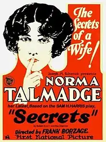 Secrets is a 1924 American silent drama film directed by Frank Borzage. The film is based upon a 1922 play of the same name, and was remade in 1933 with Mary Pickford in the leading role.[3] Although the film was never released on video or DVD, copies still exist.