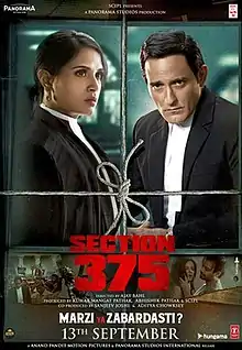 Section 375 (also known as Section 375: Marzi Ya Zabardasti)[4][5] is a 2019 Indian Hindi-language courtroom drama film produced by Kumar Mangat Pathak, Abhishek Pathak and SCIPL, written by Manish Gupta and directed by Ajay Bahl.[6][7] It is based on Section 375 of the Indian Penal Code laws in India.[8][9] [10][11] The film stars Akshaye Khanna, Richa Chadha, Meera Chopra and Rahul Bhat.[12] Principal photography of the film began in January 2019.[13]