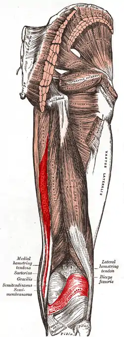 It also helps to medially rotate the knee: the tibia medially rotates on the femur when the knee is flexed. It medially rotates the femur when the hip is extended. The muscle can also aid in counteracting the forward bending at the hip joint.[1]