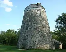 The stone walls are 32 feet (9.8 m) high and conical. At the base the diameter is 30 feet (9.1 m) and the walls are 2 feet (0.61 m) thick, but taper to 20 feet (6.1 m) across and 6 inches (15 cm) thick at the top. The mill is capped with a wooden dome that could be pivoted on a track to catch the prevailing winds. There was a small platform on the outside of the dome where the miller liked to sit and smoke his pipe. The wooden arms, covered with sailcloth, spanned 72 feet (22 m). The mill had five floors, though some were very short and only held machinery.[1]