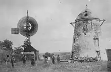 However without the expert's help, Seppmann and Hegley immediately clogged the millstone. Thinking more speed would help, they put on full sail. Instead the rising wind set the arms spinning so fast the operators couldn't stop it. The wooden parts grew so hot that the windmill was in danger of catching fire. Meanwhile, a crowd of onlookers had gathered outside, eager to see Seppmann's curiosity finally in operation and surprised that it seemed to be running so fast it might tear itself apart. In desperation Seppmann tossed something into the gears, but it shattered and a piece was flung away with such force that it shot a hole through the rim of Seppmann's hat. At last Seppmann and Hegley were able to unfurl some of the sails and halt the mill. Ultimately they learned that the clog was due to poor dressing of the millstones and after making improvements, including a better brake, were operational by late September.[1]