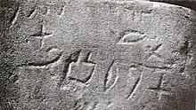 Thirty incised graffiti in a "Proto-Sinaitic script" shed light on the history of the alphabet.[1] The mines were worked by prisoners of war from southwest Asia who presumably spoke a Northwest Semitic language, such as the Canaanite that was ancestral to Phoenician and Hebrew. After a century of study and the initial publication by Sir Flinders Petrie, researchers agree on the decipherment of a single phrase, cracked in 1916 by Alan Gardiner: לבעלת l bʿlt (to the Lady) [baʿlat (Lady) being a title of Hathor and the feminine of the title Baʿal (Lord) given to the Semitic god], although the word m’hb (loved) is frequently cited as a second word.