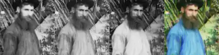 When the three color-filtered photographs were not taken at the same time, anything in the scene that did not hold steady during the entire operation would exhibit colored "fringes" around its edges in the resulting color image. If it moved continuously across the scene, three separate strongly-colored "ghost" images could result. Such color artifacts are plainly visible in ordinary color composites of many of Prokudin-Gorsky's photographs, but special digital image processing software was used to artificially remove them, whenever possible, from the composites of all 1,902 of the images commissioned by the Library of Congress in 2004.[17] The altered versions have proliferated online and older or third-party versions showing these tell-tale peculiarities are increasingly scarce.[18]