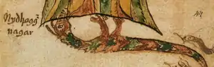 Serpents, or nāgas, play a particularly important role in Cambodian, Isan and Laotian mythology. An origin myth explains the emergence of the name "Cambodia" as resulting from conquest of a naga princess by a Kambuja lord named Kaundinya: the descendants of their union are the Khmer people.[36] George Cœdès suggests the Cambodian myth is a basis for the legend of "Phra Daeng Nang Ai", in which a woman who has lived many previous lives in the region is reincarnated as a daughter of Phraya Khom (Thai for Cambodian) and causes the death of her companion in former lives who has been reincarnated as a prince of the Nagas. This leads to war between the "spirits of the air" and the Nagas: Nagas amok are rivers in spate, and the entire region is flooded.[37] The Myth of the Toad King tells how introduction of Buddhist teachings led to war with the sky deity Phaya Thaen, and ended in a truce with nagas posted as guardians of entrances to temples.[38]