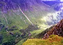 From the northern flank, the mountain can be ascended directly using one of the three ridges that descend to the glen. The most popular of these is up the north west ridge from Achriabhach where there is a carpark but it is also possible to ascend from upper Glen Nevis via the north east or east ridges which spring from the Allt Coire a’ Mhàil above the An Steall Ban waterfall. Both these routes require some scrambling. A more circuitous ascent goes up to the head of Coire a' Mhusgain from Achriabhach to cross the ridge to the summit. The summit cairn is substantial being made up of light coloured quartzite stones and gives a view of the southern side of Ben Nevis, and also an aerial view down into Glen Nevis.