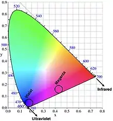Magenta is not a spectral but an extraspectral color: it cannot be generated by light of a single wavelength. Humans, being trichromats, can only see as far as 380 nanometers into the spectrum, i.e., as far as violet.