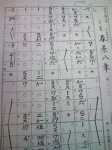 Tablature can be written in traditional Japanese vertical right-to-left notation, or it can be written in more modern horizontal left-to-right notation, which resembles modern guitar tablature. In traditional vertical notation, Chinese characters and older symbols for dynamics are used, however notation from Western style music notation, such as Italian names for dynamics, time signature and the fermata have been imported. What tuning a work calls for is usually indicated on the tablature.
