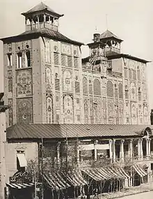 Before his visit to Europe, Naser al-Din Shah Qajar, the fourth king of Qajar Dynasty, was thinking of building a mansion in his capital to compete with Isfahan’s Ālī Qāpū. A tall building that he could stand on its roof and see the entire Tehran. By his order, Shams-ol-Emareh building was started in 1865 and was finished in two years. Naser al-Din Shah took his guests to the roof of this building to see the capital. Building’s designer was Moayer al Mamalek and the architecture was Ali Mohammed Kashi. The style of this building is a combination of traditional Iranian and Western architecture.[3]