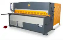A power shear is electrically or pneumatically powered hand tool designed to blank large pieces of sheet metal. They are designed to cut straight lines and relatively large radius curves. They are advantageous over a bandsaw because there is not a size limit. Large versions can cut sheet metal up to 12 gauge.[5]