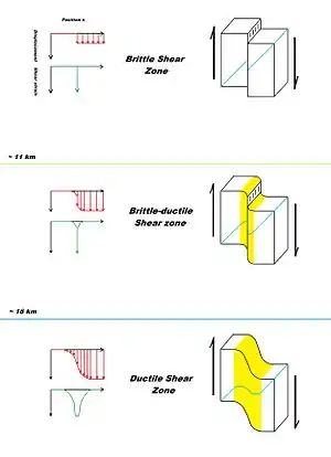 Shear zones form a continuum of geological structures, ranging from brittle shear zones (or faults) via brittle–ductile shear zones (or semibrittle shear zones), ductile–brittle to ductile shear zones. In brittle shear zones, the deformation is concentrated in a narrow fracture surface separating the wall rocks, whereas in a ductile shear zone the deformation is spread out through a wider zone, the deformation state varying continuously from wall to wall. Between these end-members, there are intermediate types of brittle–ductile (semibrittle) and ductile–brittle shear zones that can combine these geometric features in different proportions.