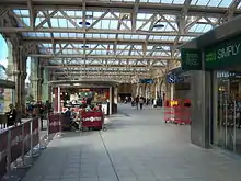 The main station entrance, facing Sheaf Square, is the location of the main concourse and most of the station's facilities. The ticket office, ticket machines, information desk and a number of retail units are located there, and public toilets and facilities such as cash machines.[47] There are further shops and facilities on the island platforms and in the Supertram entrance hall at the far side of the station. There are waiting rooms on the island platforms and the East Midlands Trains first class lounge is within the station buildings, on platform 5.