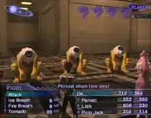Battles are governed by a turn-based mechanic called the "Press Turn" system.[2] Each character participating in combat, friend and foe alike, provides one or more Press Turns represented in the upper right-hand corner of the screen as icons. The rule behind this system is that any action (attacking, using skills, items, contacting demons, summoning commands) will normally cost one full turn. If a combatant scores a critical hit, exploits their opponent's weakness, or passes on making an action, they gain an additional turn marked by a pulsating icon. These added turns allow characters to perform all actions available within normal turns. If the player chooses to pass on an additional turn, that turn is lost. If an attack fails through missing or blocking, then multiple turns are lost: how many depends on how many combatants avoided or blocked it. If an attack heals an enemy, all remaining turns are lost. An auto-attack option is available, where party members can use standard physical attacks or repeat their actions from the previous turn.[8] Characters can escape from normal battles, with failure forfeiting a player turn. If the main character loses all health, the game ends, regardless of the status of his demons.[8][9]
