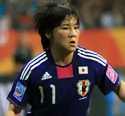 In August 2002, Ohno was selected Japan U-20 national team for 2002 U-19 World Championship. She played 4 games and scored 3 goals.[1] On 12 January 2003, she debuted for Japan national team against United States. Her first major tournament was the 2006 Asian Cup, where Japan placed fourth. The following year she played in the 2007 World Cup, but Japan fell in the group stage.[2] She also competed at the 2008 Summer Olympics, and the 2011 World Cup, where she scored a goal in the group stage match against Mexico as Japan won the championship. Ohno started the final against the United States.[3] She then competed for the Japanese silver medal-winning team at the 2012 Summer Olympics.[4] At 2015 World Cup, Japan won 2nd position. At 2016 AFC Women's Olympic Qualifying Tournament, following Japan's failure to qualify for the 2016 Summer Olympics. This tournament became her last match for Japan. She played 139 games and scored 40 goals for Japan until 2016.