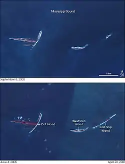 ![]() Aerial view of previously divided Ship Island, looking east (with West Ship Island in foreground) | |