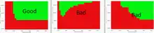 Automated test equipment have traditionally generated a two-dimensional, ASCII form of the shmoo plot that uses an "X" to represent functional points and blank space for non-functional points. In modern times plots with two colors (e.g. red/green) or even multi colored plots in form of digital spread sheet documents and alike became also common, even if the traditional form is still in use.[5] For testing efficiency sometimes only the border of interest (where a certain value changes its state) is backed up with data in the diagrams thus (often reasonably) assuming the areas outside those transition will stay at those state.[6]
