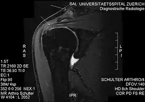 Plain x-rays of the shoulder can be used to detect some joint pathology and variations in the bones, including acromioclavicular arthritis, variations in the acromion, and calcification. However, x-rays do not allow visualization of soft tissue and thus hold a low diagnostic value.[2] Ultrasonography, arthrography and MRI can be used to detect rotator cuff muscle pathology. MRI is the best imaging test prior to arthroscopic surgery.[2] Due to lack of understanding of the pathoaetiology, and lack of diagnostic accuracy in the assessment process by many physicians,[18] several opinions are recommended before intervention.