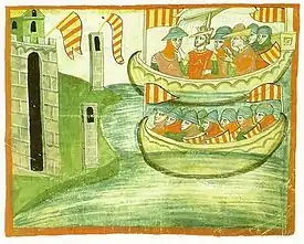 After leaders were elected in Palermo, messengers spread word across the island for the rebels to strike before the French had time to organise resistance. In a fortnight the rebels gained control over most of the island, and within six weeks it was all under rebel control, except for Messina which was well fortified, and whose leading family, the Riso, remained faithful to Charles. But on 28 April it too broke into open revolt under the command of Captain of the People Alaimo da Lentini and, most significantly, the islanders' first act was to set fire to Charles's fleet in the harbor.[11] It is reported that upon hearing of the fleet's destruction, King Charles exclaimed "Lord God, since it has pleased You to ruin my fortune, let me only go down in small steps."[12]