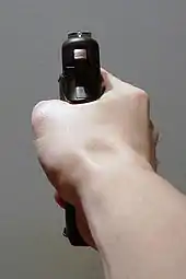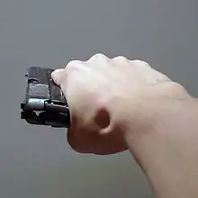 The side grip is a technique for shooting a handgun in which the weapon is rotated about ninety degrees and held horizontally instead of vertically (as is normally done). Shooting a gun in this way has no practical benefit under most circumstances and makes proper aiming very difficult, but the style has become somewhat popular in hip hop culture and among street criminals (who do not often use the gun sight)[1] due to its portrayal in American film and television since the early 1990s.[2]