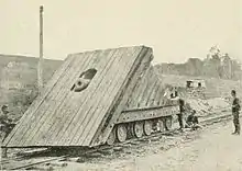 The Federal forces mounted a 13-inch Coehorn mortar on a railroad flatcar. This mortar was nicknamed the Dictator. The car was fired from a section of the Petersburg and City Point Railroad where moving the car along a curve in the track trained the gun on different targets along the Confederate lines. When charged with 14 pounds of powder the mortar would recoil less than two feet on the flatcar, but the flatcar would recoil 10 to 12 feet on the tracks. The plane of fire had to be nearly parallel to the tracks, to allow the flatcar to recoil and avoid dismounting the mortar, but by using a curved section of track a wide traverse could be achieved. Fire from the Dictator was very effective. At a range of 3,600 yards, one round was reported as having blown a Confederate field gun and carriage above the parapet of the Confederate works (Abbot 1867, p. 23). The Dictator silenced the Confederate guns on Chesterfield Heights to prevent them from enfilading the right end of the Union line.[1]
