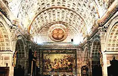 It consists of predella with three bodies of different orders, Ionic, Corinthian and compound,[50] and a superior crowning. In the predella there are four reliefs with scenes of the Passion of Christ. In the first body, in the central street there is a tabernacle of three floors with the images of St. Peter and St. Paul, the Last Supper and on the top floor the Savior. In the side streets with the separation made with Ionic columns, the figures of Saint Andrew and Saint Francis of Assisi are at the ends, on the right side street the Transfiguration of Christ and on the left side the Immaculate Conception. In the second body the order of the columns is Corinthian, in the central street is the Assumption, on the right side a large relief of the Adoration of the Kings, in the side of the Nativity and in the extremes the images of Santa Ana and Santa Librada. In the third body in the central part there is a Calvary: Christ on the cross with Mary and Saint John the Baptist and on its sides the reliefs of the Pentecost and the Ascension of Christ with two exempt figures of saints in each end. The final crowning of the altarpiece was made with a large shield of the bishop commissioner supported by two angels and two representations of the virtues.[51]