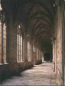 The new Gothic-style cloister, in substitution of the previous Romanesque one, which had a dilapidated wooden roof, was rebuilt in 1505, on the initiative of the bishop and Cardinal Bernardino López de Carvajal (1495 - 1511), already appointed cardinal and resident in Rome, with the help of Cardinal Cisneros, former senior chaplain of the cathedral in the time of the bishop Cardinal Mendoza. It is of Late Gothic style, with Renaissance elements, the vaults of the galleries are of sexpartite cross with the keystone in polychrome representing the shields of the cathedral chapter and the bishop López de Carvajal. In the eastern part, there is the summer chapter house, the old chapel of Our Lady of Peace and Diocesan Museum, which is decorated with a magnificent collection of Flemish tapestries, the chapel of Saint James, son of Zebedee and the library with a portal with Plateresque decoration of the 16th century. The south gallery is also dedicated to burials and the Puerta del Jaspe that communicates with the cathedral is located there. In the north gallery is the chapel of la Concepción and the western part is mediating with the parish of San Pedro, old sacristy.[63]