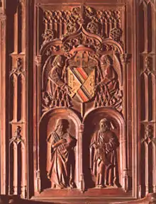 At the center of this ashlar is the episcopal chair of back carved with images and the shield of Cardinal Mendoza, it is covered with a large canopy with pinnacle made in the same style. The carvers sculptors who worked in the choir stalls under the direction of Martín Sánchez were different, also the neighbor of Sigüenza named Alfonso González participated, in 1503 they were working on it, Petit Juan, Francisco Coca and Martín Vandoma, the chair of the bishop was believes that it was made by the teacher Rodrigo Alemán, who also worked in the low seating.[52]