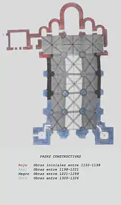 The Romanesque temple had a floor plan of three naves and a head with five apses staggered from the sides to the much larger central one. On both sides of the facade there were two defense towers. The second bishop Peter of Leucate (1154 - 1156) - also of French origin and nephew of the previous one - is the one with whom the works of the new cathedral really begin with projects of masters of the Languedoc, which followed the guidelines of the Order of Cluny, already introduced in the country. The construction began with the head, the foundations of the walls and the towers. During the years of the mandate of the next bishop Cerebruno (1156 - 1167), a native of Poitiers, a great impulse was given to the works, closing the naves of the transept. With the fourth bishop Joscelmo (1168 - 1177), upon arrival of the construction at crossing and its transverse nave, on June 19 of 1169 was open to worship; this is attested by a Chi Rho in the tympanum of the door of the tower of the Rooster, which indicates that the works would have reached this part of the transept. The five altars of the apses were already consecrated at the end of the 12th century, to continue with the norm of the time when at least five canonges could say mass individually.[11]