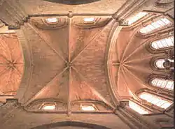 The naves are separated, by enormous pillars, which are each composed of twenty columns attached to capitals of vegetable theme, where the arc-doubleaus and formero arcs are supported. From the capitals, the stony nerves, which form the ogival vaults of rib vault, in general are of simple crossery -with two diagonal nerves-, although there are two sexpartite vaults, on the sides of the transept or even octopartite, on the lantern tower. Three of the four pillars that frame the choir are different from the rest of the building, consisting of large cylindrical columns with Romanesque ornamentation in the lower part and Gothic in the upper one.[16]