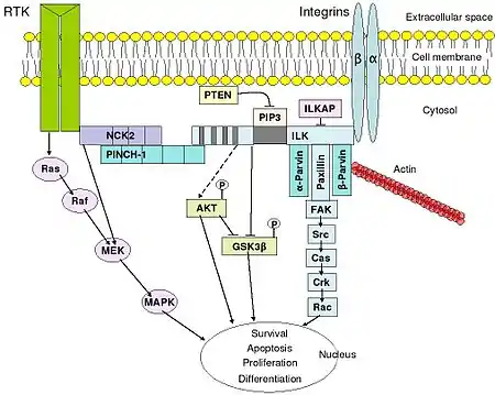 Integrins are produced by a wide variety of cells; they play a role in cell attachment to other cells and the extracellular matrix and in the transduction of signals from extracellular matrix components such as fibronectin and collagen. Ligand binding to the extracellular domain of integrins changes the protein's conformation, clustering it at the cell membrane to initiate signal transduction. Integrins lack kinase activity; hence, integrin-mediated signal transduction is achieved through a variety of intracellular protein kinases and adaptor molecules, the main coordinator being integrin-linked kinase.[37] As shown in the adjacent picture, cooperative integrin-RTK signaling determines the timing of cellular survival, apoptosis, proliferation, and differentiation.