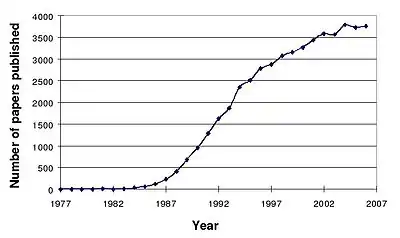 In 1970, Martin Rodbell examined the effects of glucagon on a rat's liver cell membrane receptor. He noted that guanosine triphosphate disassociated glucagon from this receptor and stimulated the G-protein, which strongly influenced the cell's metabolism. Thus, he deduced that the G-protein is a transducer that accepts glucagon molecules and affects the cell.[60] For this, he shared the 1994 Nobel Prize in Physiology or Medicine with Alfred G. Gilman. Thus, the characterization of RTKs and GPCRs led to the formulation of the concept of "signal transduction", a word first used in 1972.[61] Some early articles used the terms signal transmission and sensory transduction.[62][63] In 2007, a total of 48,377 scientific papers—including 11,211 review papers—were published on the subject. The term first appeared in a paper's title in 1979.[64][65] Widespread use of the term has been traced to a 1980 review article by Rodbell:[60][66] Research papers focusing on signal transduction first appeared in large numbers in the late 1980s and early 1990s.[46]