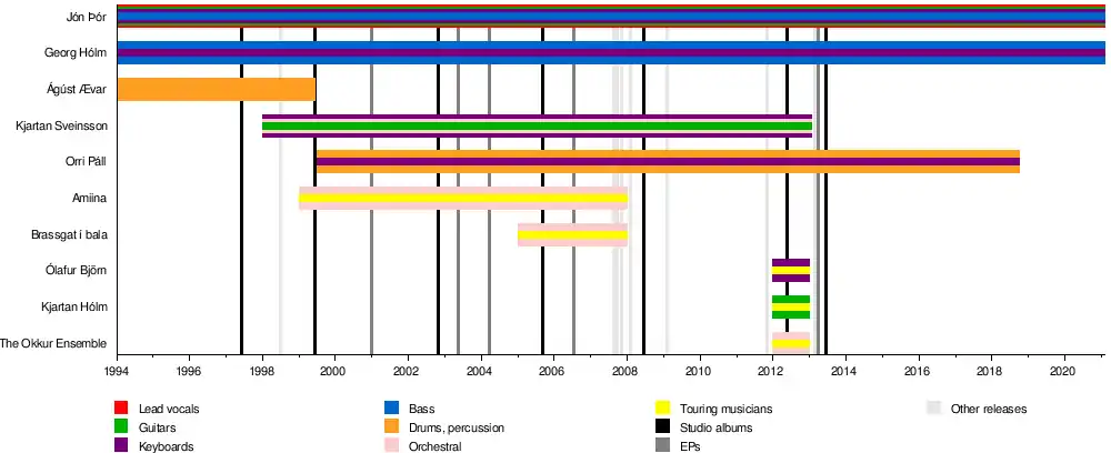 listen))[6] is an Icelandic post-rock band from Reykjavík, active since 1994. Known for their ethereal sound, frontman Jónsi's falsetto vocals, and their use of bowed guitar,[7] the band's music incorporates classical and minimal aesthetic elements.[8][9]