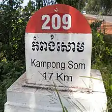 The alternative name, Kompong Saom (also romanized as Kompong Som and Kampong Som), (Khmer: កំពង់សោម) means 'Port of the Moon' or 'Shiva's Port'.[22] Saom is derived from the Sanskrit word saumya, the original (Rig Vedic) meaning of which was Soma, the 'juice or sacrifice of the moon-god', but evolved into Pali 'moon', 'moonlike' 'name of Shiva'.[23] The word kampong or kompong is of Malay origin[24] and means 'village' or 'hamlet'. Its meaning underwent extension towards 'pier' or river 'landing bridge'.[25]
