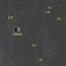 By convention these features are identified on lunar maps by placing the letter on the side of the crater midpoint that is closest to Sinas.