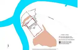 The area between the rivers and the castrum, Sava and Danube's alluvial plane, was occupied by a suburb Lower Town. Located below the castrum, it was protected by the ramparts and towers. South of the fort there was another suburb, a civilian Roman town. Next to the Lower Town, on the right bank of the Danube, there was a port, which was operational until the 18th century.[4]
