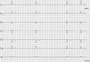 The primary 12-lead electrocardiogram (ECG) finding in sinus node dysfunction is inappropriate sinus bradycardia.[7] Sinus node dysfunction can also present with sudden sinus arrest with or without junctional escape, sinoatrial block, prolonged asystolic period followed by tachycardias, or tachycardia-bradycardia syndrome presenting as various atrial arrhythmias such as atrial fibrillation, flutter, tachycardia, or paroxysmal supraventricular tachycardia.[7][5]