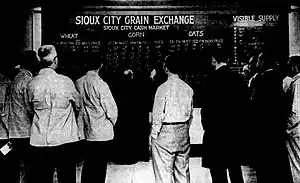 The Sioux City Grain Exchange (SCGX) was a cash commodity market in Sioux City, Iowa that primarily traded corn, wheat, oat, and soybean. It was established in 1907 as the Sioux City Board of Trade, named the "fastest growing grain market in the world" in 1929,[1] and among the largest exchanges in the world by the 1970s; transacting over 100 million bushels annually (valued at $1 billion as of 2018).[2][3][4] It served the Corn Belt (primarily Iowa, Nebraska, South Dakota, and Minnesota) and primarily competed against the Chicago Mercantile Exchange, Minneapolis Grain Exchange and Kansas City Board of Trade. SCGX's rise and decline was driven by barge navigation of the Missouri River and mirrored the Sioux City Livestock Exchange (Sioux City Stockyards), the largest in the world during the 1970s.[5] Both were co-founded by Vermont banker Fred L. Eaton.[6]