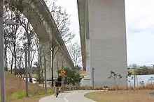 The Wynnum Road upgrade was completed on 13 July 2007 and 2 additional southbound lanes between the Port of Brisbane Motorway and Wynnum Road completed in late 2007. Four of six lanes of the new Gateway Motorway deviation were opened in July 2009. All works south of the river were complete by the end of 2009 after 10 years of constant roadwork and traffic disruption. The final concrete pour linking the sides of the new bridge was made in late October 2009.[12] A total of 748 concrete segments, which are supported by 17 piers, were placed for the new bridge.[18]
