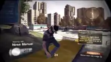 The player can gain points by performing tricks, such as ollies, flip tricks, grinds and grabs. A feature returning from Skate is the "Flickit" control scheme, which requires the user to move the controller's right stick in certain patterns to perform tricks using the skateboarder's feet.[3]:2[4] Points gained from a trick are based on multiple factors, such as its height, length and complexity. The player can perform multiple tricks at a time, which are then combined into a "sequence," scoring more points than individual tricks.[3]:5 Performing multiple sequences starts a timer, and performing sequences within the timer creates a "line," which scores more points than performing individual sequences. Once the line timer runs out, the points gained from the line are added to the player's score.[3]:6