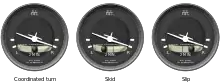 In a straight flight, the tail of the airplane aligns the fuselage into the relative wind. However, in the beginning of a turn, when the ailerons are being applied in order to bank the airplane, the ailerons also cause an adverse yaw of the airplane. For example, if the airplane is rolling clockwise (from the pilot point of view), the airplane yaws to the left. It assumes a crab-like attitude relative to the wind. This is called a slip. The air is flowing crosswise over the fuselage. In order to correct this adverse slip, the pilot must apply rudder (right rudder in this example). If the pilot applies too much rudder, the airplane will then slip to the other side. This is called a skid.
