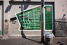 The Skid Row City Limit Mural is an 18-by-50-foot (5.5 by 15.2 m) mural displayed on San Julian Street in Los Angeles, California. It features a map demarcating Skid Row's legally recognized boundaries alongside an official-looking sign, replete with city seal, reading "Skid Row City Limit, Population: Too Many." This is the initial installation of a mural project that will eventually cover the whole wall on the San Julian block just north of 6th Street (Closest address is 570 south San Julian street).[1][2]